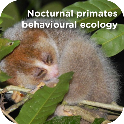 Tarsiers and lorises are hand-captured opportunistically. Animals are measured in situ, and a small radio collar is fitted on suitable animals. Once the collar is fitted comfortably, they are immediately released to the tree where they were caught. Using the VHF tracking system, sleeping sites of the collared slow lorises and tarsiers are found every day, and the trees are marked in order to record re-use and return rates of sleeping trees, as well as to allow characteristics of the sleeping site area to be recorded at a later time. Nocturnal ranging behaviour is collected by following collared individuals for 6-hour shifts (18:00-00:00 and 00:00- 06:00), recording the individuals behaviour and location at set intervals. Environmental conditions are also recorded. Head torches with white light were used to locate the animals due to their reflective eye shine. Once the animal was spotted red filters were preferred, as studies indicate that red lights are less disturbing (Nekaris et al., 2008).